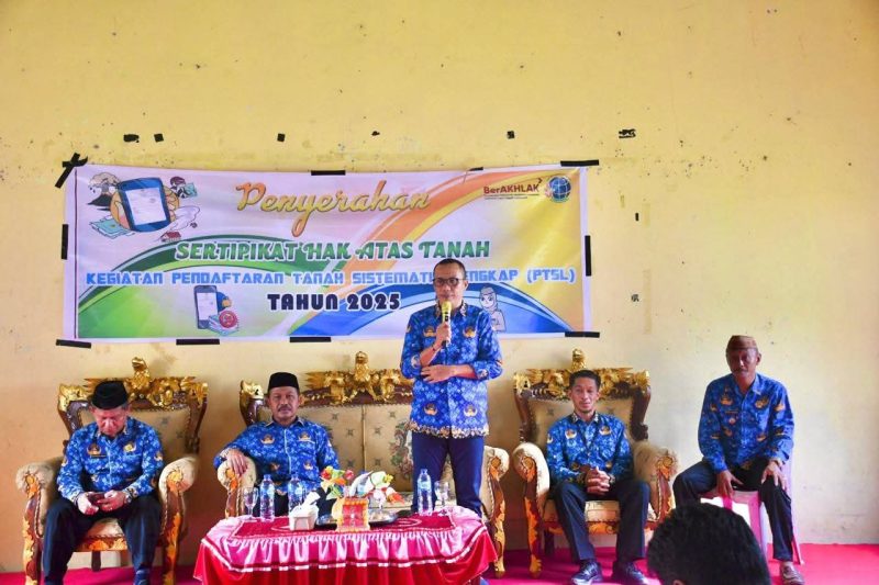 BOALEMO (JM) – Wakil Bupati Boalemo, Lahmudin Hambali, S.Sos., M.Si., mengapresiasi langkah Kantor Pertanahan Kabupaten Boalemo dalam mendukung percepatan legalisasi aset masyarakat melalui Program Pendaftaran Tanah Sistematis Lengkap (PTSL) Tahun Anggaran 2025. Hal ini disampaikan saat menghadiri penyerahan 167 Sertipikat Hak Atas Tanah kepada warga dari enam desa di Kecamatan Botumoito, Kamis (17/7/2025).